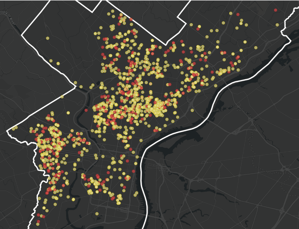 • High Priority (red): Properties in areas with gun crime rates more than one standard deviation above average and either have code violations, high complaint density, or are not in PHS LandCare. Also includes properties with medium gun crime rates that have violations/complaints but aren’t in PHS LandCare and have very low tree canopy (less than 70% coverage).