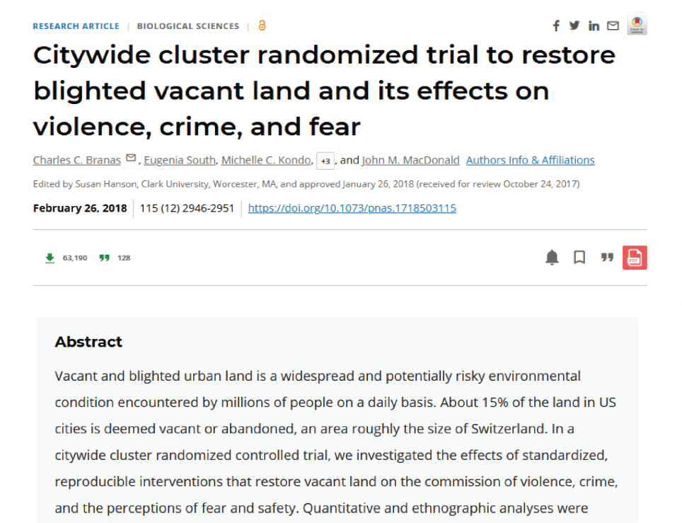 Research shows that greening and cleaning vacant properties is one of the most impactful, cost-effective interventions available to reduce gun violence in a neighborhood. For example, Dr. Eugenia South and her team have demonstrated that greening vacant lots in Philadelphia reduced gun violence by as much as 29% in the surrounding area.